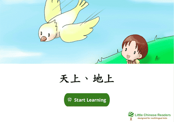 Each lesson starts with a vocabulary module so we learn new words via a book-like fun reading exercise, complete with sounds clips, cute pictures, English translation, and pinyin/zhuyin assistance (wherever you need it). Let’s learn! New Vocabulary: 天、地、鳥、飛、跑 New Vocabulary: 天、地、鸟、飞、跑