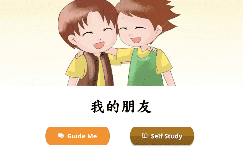 Each lesson starts with a vocabulary module so we learn new words via a book-like fun reading exercise, complete with sounds clips, cute pictures, English translation, and pinyin/zhuyin assistance (wherever you need it). Let’s learn! New Vocabulary: 看、他、朋友、(一)起 New Vocabulary: 看、他、朋友、(一)起