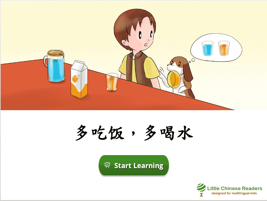 Each lesson starts with a vocabulary module so we learn new words via a book-like fun reading exercise, complete with sounds clips, cute pictures, English translation, and pinyin/zhuyin assistance (wherever you need it). Let’s learn! New Vocabulary: 水、飯、喝、果、汁 New Vocabulary: 水、饭、喝、果、汁