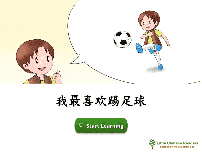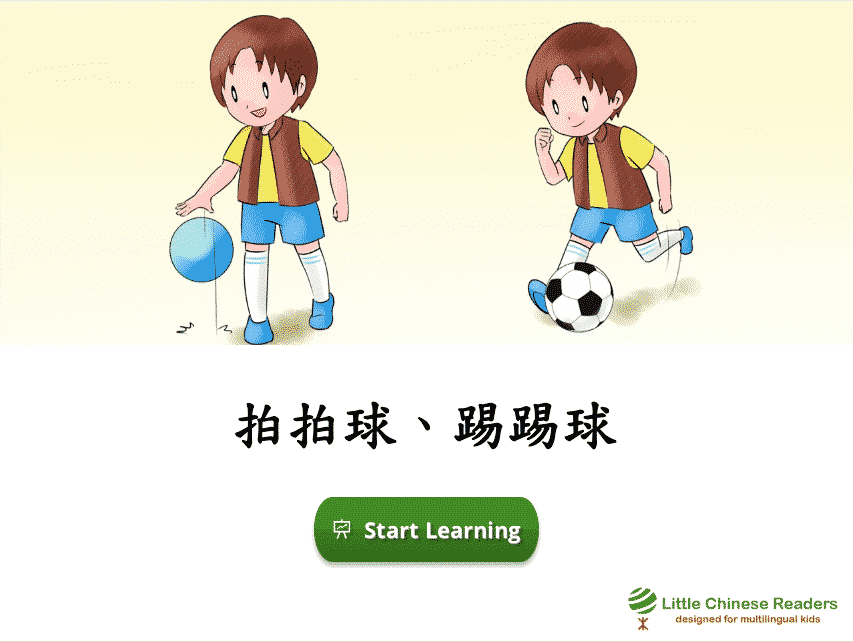 Each lesson starts with a vocabulary module so we learn new words via a book-like fun reading exercise, complete with sounds clips, cute pictures, English translation, and pinyin/zhuyin assistance (wherever you need it). Let’s learn! New Vocabulary: 踢、拍、用、把、能 New Vocabulary: 踢、拍、用、把、能