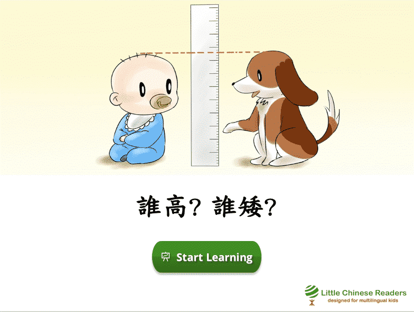 Each lesson starts with a vocabulary module so we learn new words via a book-like fun reading exercise, complete with sounds clips, cute pictures, English translation, and pinyin/zhuyin assistance (wherever you need it). Let’s learn! New Vocabulary: 高、矮、比、樣、可 New Vocabulary: 高、矮、比、样、可