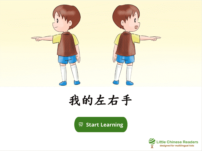 Each lesson starts with a vocabulary module so we learn new words via a book-like fun reading exercise, complete with sounds clips, cute pictures, English translation, and pinyin/zhuyin assistance (wherever you need it). Let’s learn! New Vocabulary: 左、右、手、腳、動 New Vocabulary: 左、右、手、脚、动