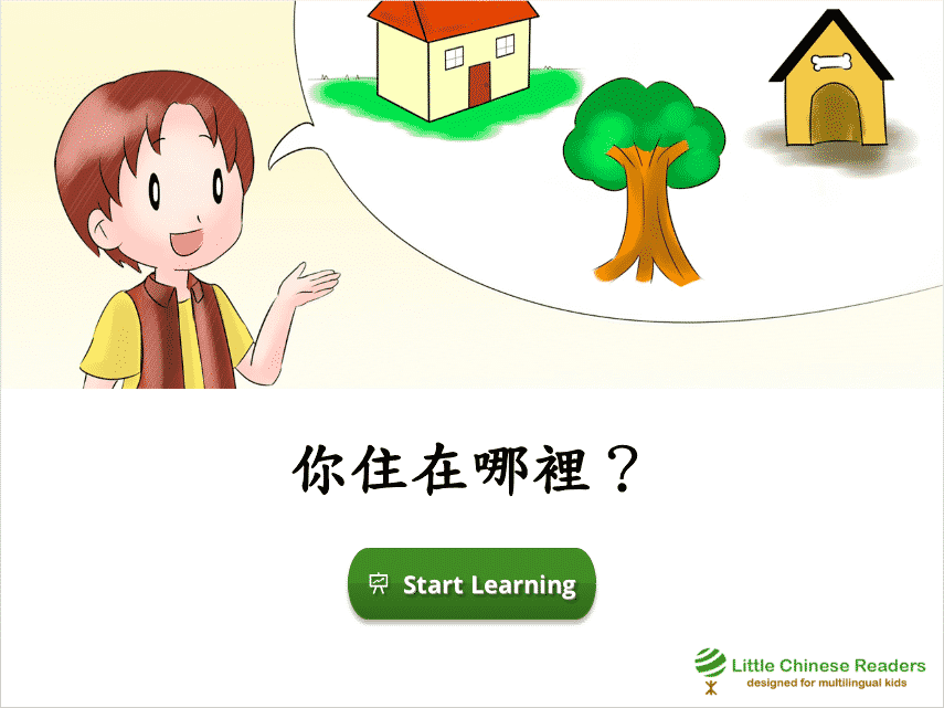 Each lesson starts with a vocabulary module so we learn new words via a book-like fun reading exercise, complete with sounds clips, cute pictures, English translation, and pinyin/zhuyin assistance (wherever you need it). Let’s learn! New Vocabulary: 外、哪、進、住 New Vocabulary: 外、哪、进、住