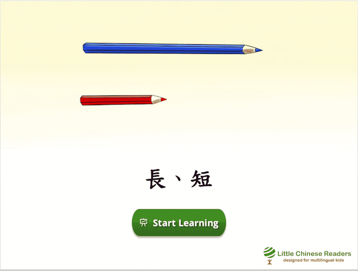 Each lesson starts with a vocabulary module so we learn new words via a book-like fun reading exercise, complete with sounds clips, cute pictures, English translation, and pinyin/zhuyin assistance (wherever you need it). Let’s learn! New Vocabulary: 長、短、得、更、最 New Vocabulary: 长、短、得、更、最