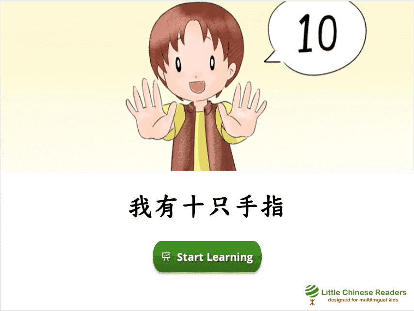 Each lesson starts with a vocabulary module so we learn new words via a book-like fun reading exercise, complete with sounds clips, cute pictures, English translation, and pinyin/zhuyin assistance (wherever you need it). Let’s learn! New Vocabulary: 指、六、七、八、九、十 New Vocabulary: 指、六、七、八、九、十