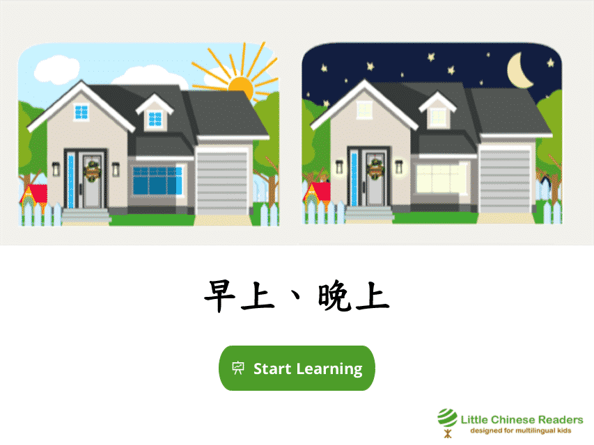 Each lesson starts with a vocabulary module so we learn new words via a book-like fun reading exercise, complete with sounds clips, cute pictures, English translation, and pinyin/zhuyin assistance (wherever you need it). Let’s learn! New Vocabulary: 門、出、早、晚、回 New Vocabulary: 门、出、早、晚、回