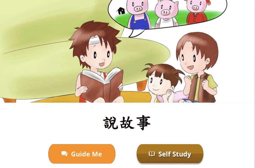 Each lesson starts with a vocabulary module so we learn new words via a book-like fun reading exercise, complete with sounds clips, cute pictures, English translation, and pinyin/zhuyin assistance (wherever you need it). Let’s learn! New Vocabulary: 說、故、事、想、聽 New Vocabulary: 说、故、事、想、听