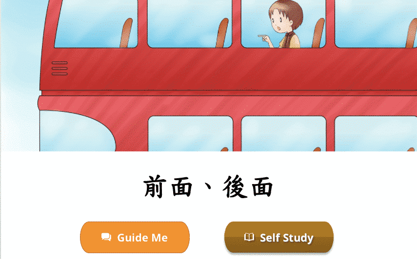 Each lesson starts with a vocabulary module so we learn new words via a book-like fun reading exercise, complete with sounds clips, cute pictures, English translation, and pinyin/zhuyin assistance (wherever you need it). Let’s learn! New Vocabulary: 面、前、後、誰 New Vocabulary: 面、前、后、谁